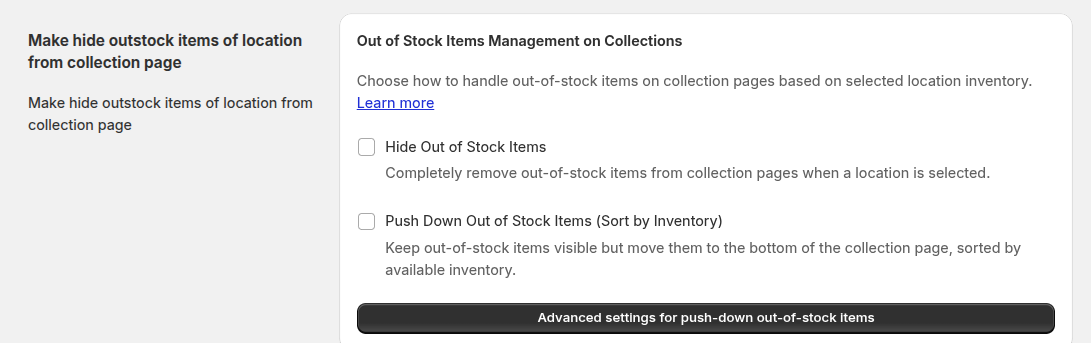 Control how out-of-stock items are displayed based on selected location inventory. Give customers a smoother shopping experience by tailoring product visibility in your collections: