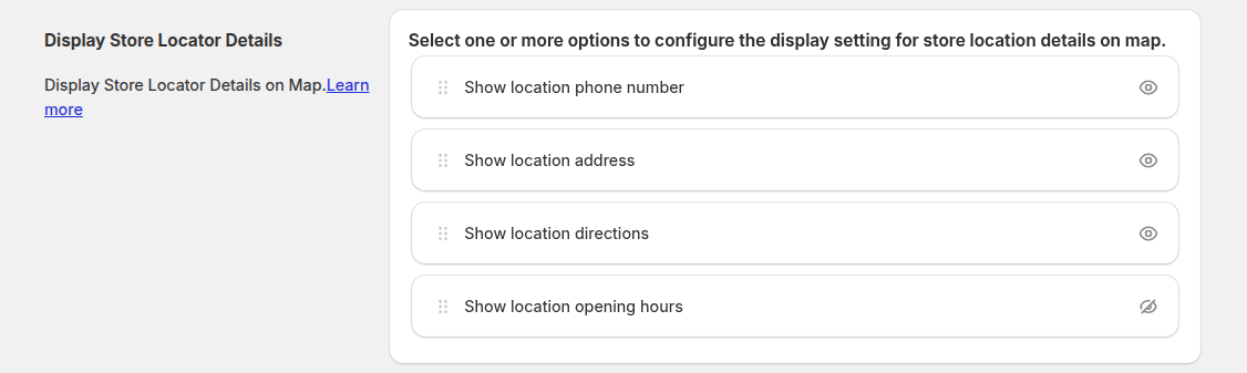 Here, you define what information is shown about the selected location directly in the Adreess for store locator. You can choose to display one or more of the following: Show Location Address Displays the full address of the selected location. Helps users quickly confirm they’ve selected the right place. Show Location Phone Number Displays the contact number. Useful for users who may want to call the location directly Show Location Notes Displays any custom notes (e.g., “Pickup at rear entrance”). Good for including extra location-specific instructions or details**.** Show Location Directions Provides a button or link to get directions (often using a map or navigation app). Enhances user convenience by offering a direct route to the location.